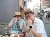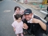 「ぎょうざの冨士」の女将さんに買ってもらった『鮎』を頬張る巡回前の編集長。